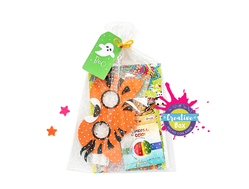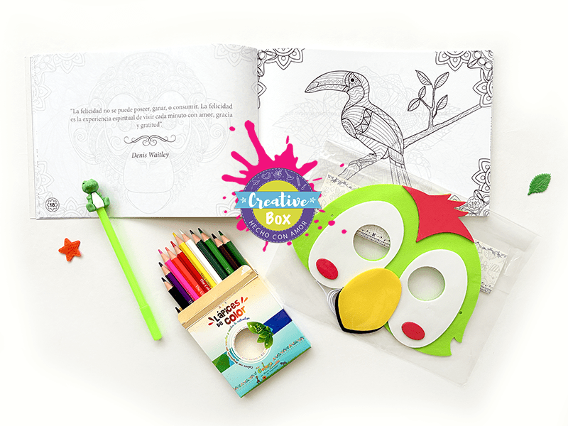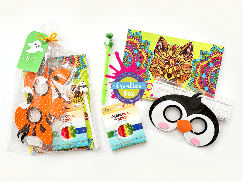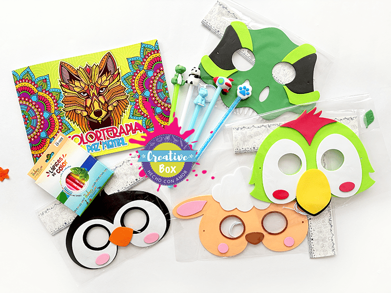 Detalle sorpresa SIN DULCES para niños creativos con máscara antifaz de animales y libro para colorear mandalas, animales y paisajes. Recomendada para niños y niñas desde 5 años años! Empacado con mucho amor en papel transparente o bolsa de tela ecológica.