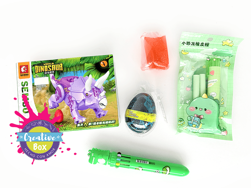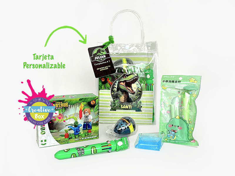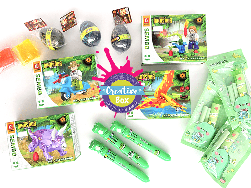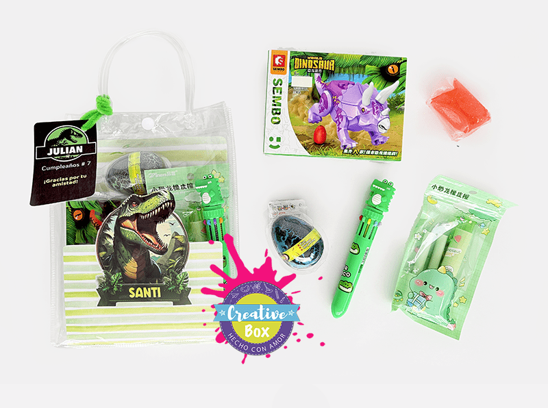 Sorpresa kit creativo para niños, con diseño de Dinosaurios. Detalles divertidos para niños de 5 a 10 años. Empacadas en bolsita transparente individual o bolsa de tela ecológica.