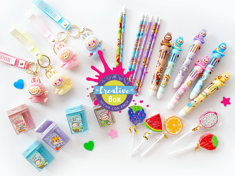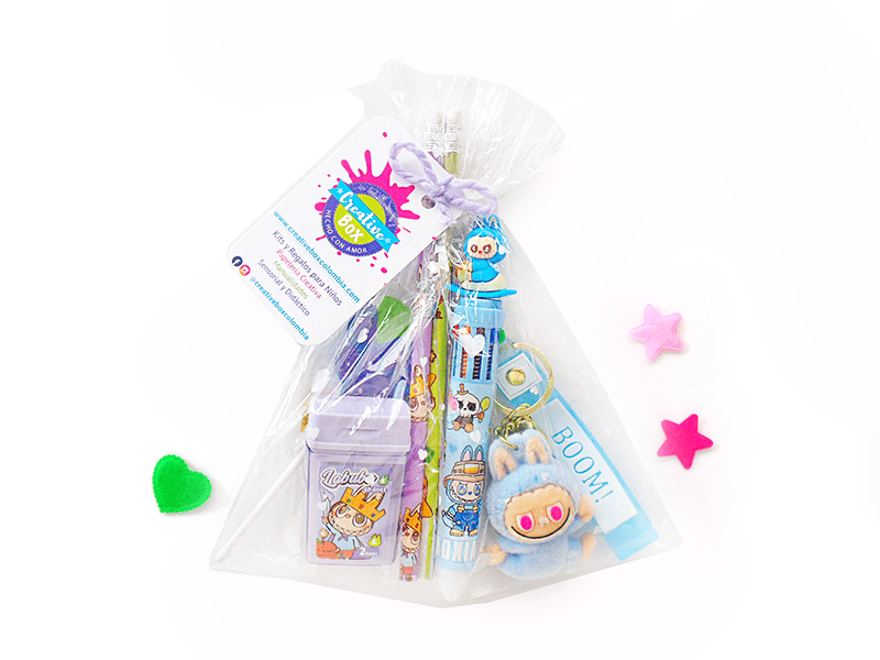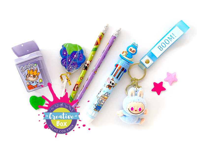 Mini kit sorpresa para fiesta infantil con elementos de Labubu y llavero  para niñas de 5 años en adelante.  Bolígrafos y elementos de escritura son parte de este pack creativo.