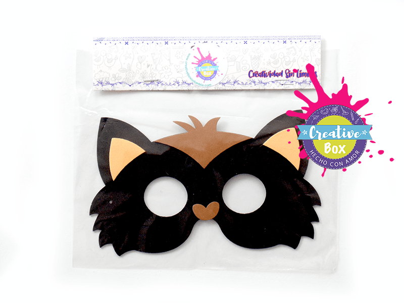 Diseño Gato, colores iguales a la imagen negro con detalles color marrón y piel en foamy. ideal para disfraz de Gatito. Tamaño 21 cm de ancho x 13 cm de alto. Empacada en bolsa Individual.